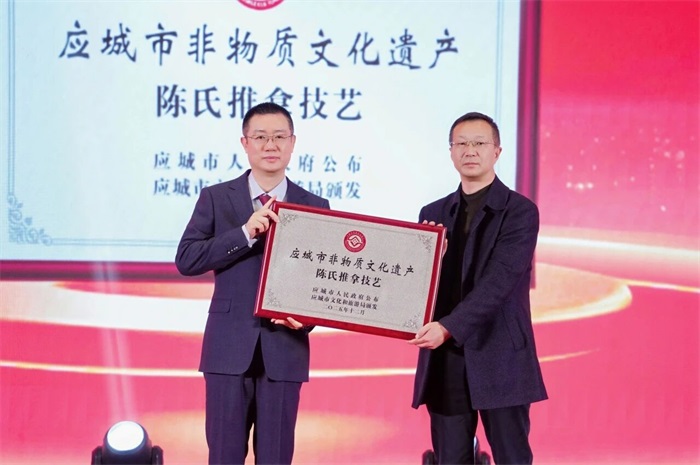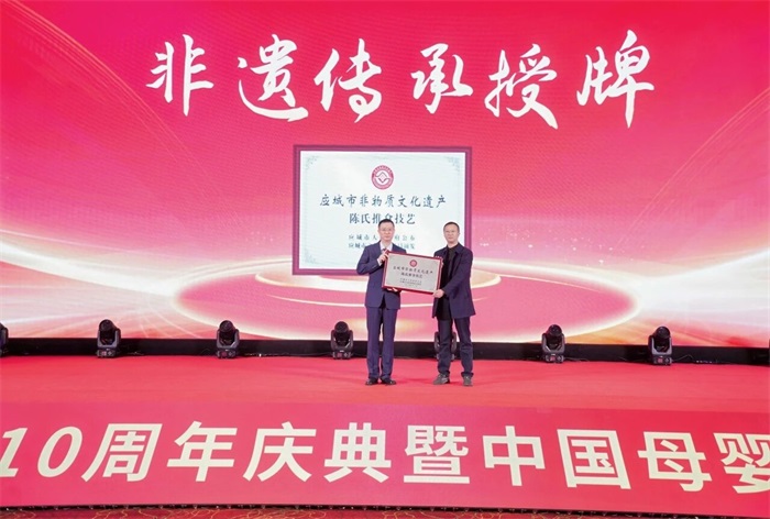 在全场嘉宾的见证下,大会播放六子巢非遗传承纪录片与陈氏儿推纪录片,生动展现研妆实业在非遗文化传承与母婴健康服务融合上的深耕与探索。随后,现场举行隆重的“陈氏小儿推拿项目授牌”仪式,这是继“六子巢特膳口饮液”获评“中国非物质文化遗产”后,研妆在非遗传承领域的又一重要成果。应城市文化和旅游局领导亲临现场,对研妆将传统中医药文化与现代母婴服务深度结合的举措给予高度评价,称其“让非遗真正走进母婴家庭,为行业树立了文化与产业融合的优秀典范”。作为湖北应城本土标杆企业,研妆始终以非遗文化为内核赋能产业发展,彰显了企业在传承中华优秀传统文化中的责任与担当。