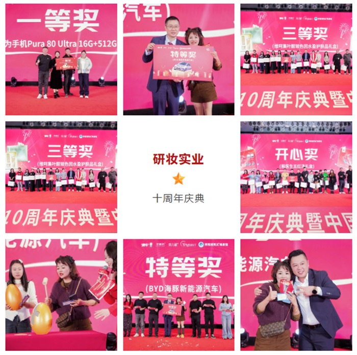 12月16日晚间,研妆实业十周年庆典晚宴盛大开启。晚宴上,陈出新创始人发表祝酒词,回顾企业十年发展历程,向全体合作伙伴致以诚挚感谢。随后的颁奖环节,大会对2025年度优秀门店、优秀调理型门店、优秀代理商进行表彰,通过播放获奖视频、现场颁奖等形式,激励行业伙伴携手共进。晚宴还穿插了文艺节目、抽奖互动等环节,现场气氛热烈,充分展现了研妆与渠道伙伴的深厚情谊。