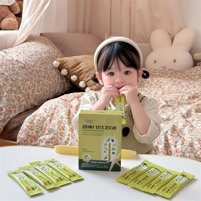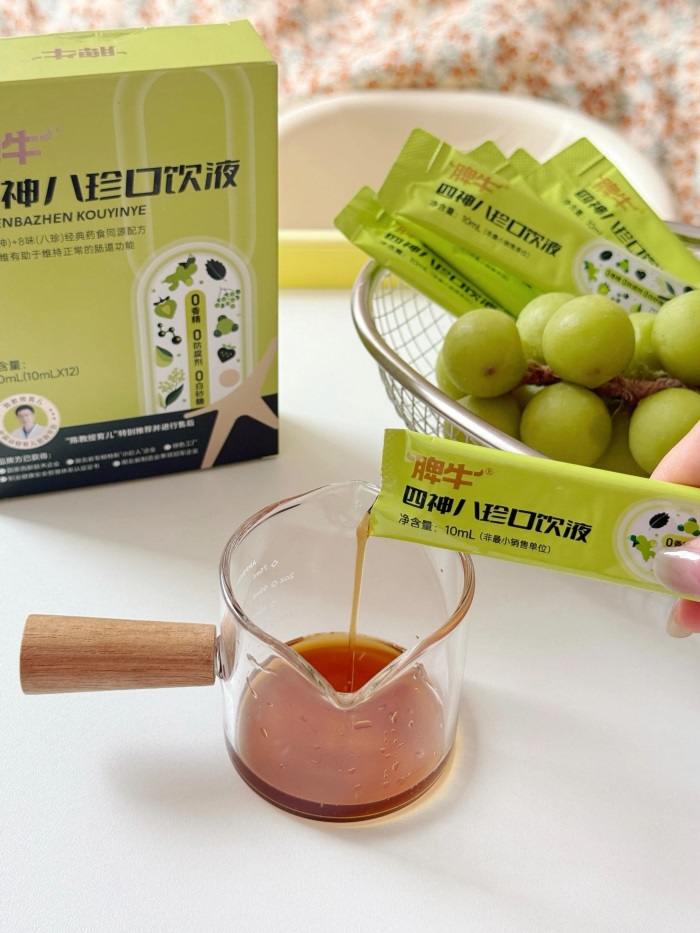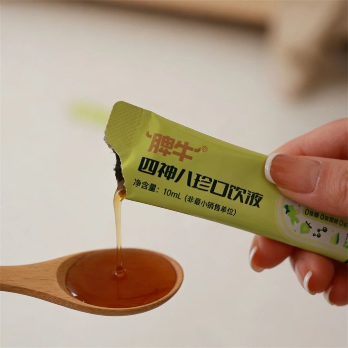 这两大经典古方,正是脾牛四神八珍口饮液的研发溯源。脾牛团队深知传统古方的养生精髓,但也关注到现代孩子体质娇嫩,不耐过度温补。因此在传承 “四神汤” 与 “八珍糕” 核心智慧的基础上,团队大胆改良升级,剔除配方中过于滋补、负担较重的成分,将人参替换为更温和的党参,优化食材配比,让配方更温和适配现代儿童肠胃,同时兼顾成人与长辈的养护需求,最终打造出这款全龄适用的脾胃养护佳品。
