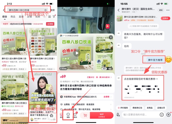 1、打开抖音app搜 “脾牛四神八珍口饮液”,点视频里的商品链接;